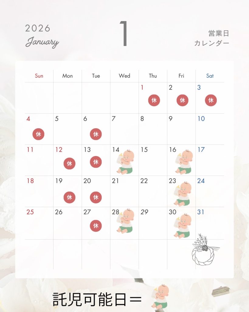 明けましておめでとうございます!今年も子育て奮闘中のパパ、ママのために託児サービスをスタートします!1月は5日間と少ないのでお早めのご予約をお願いします!
