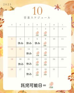10月の託児スケジュールになります!今月もいつもと同じで水曜日、木曜日の9時〜13時の間になります!